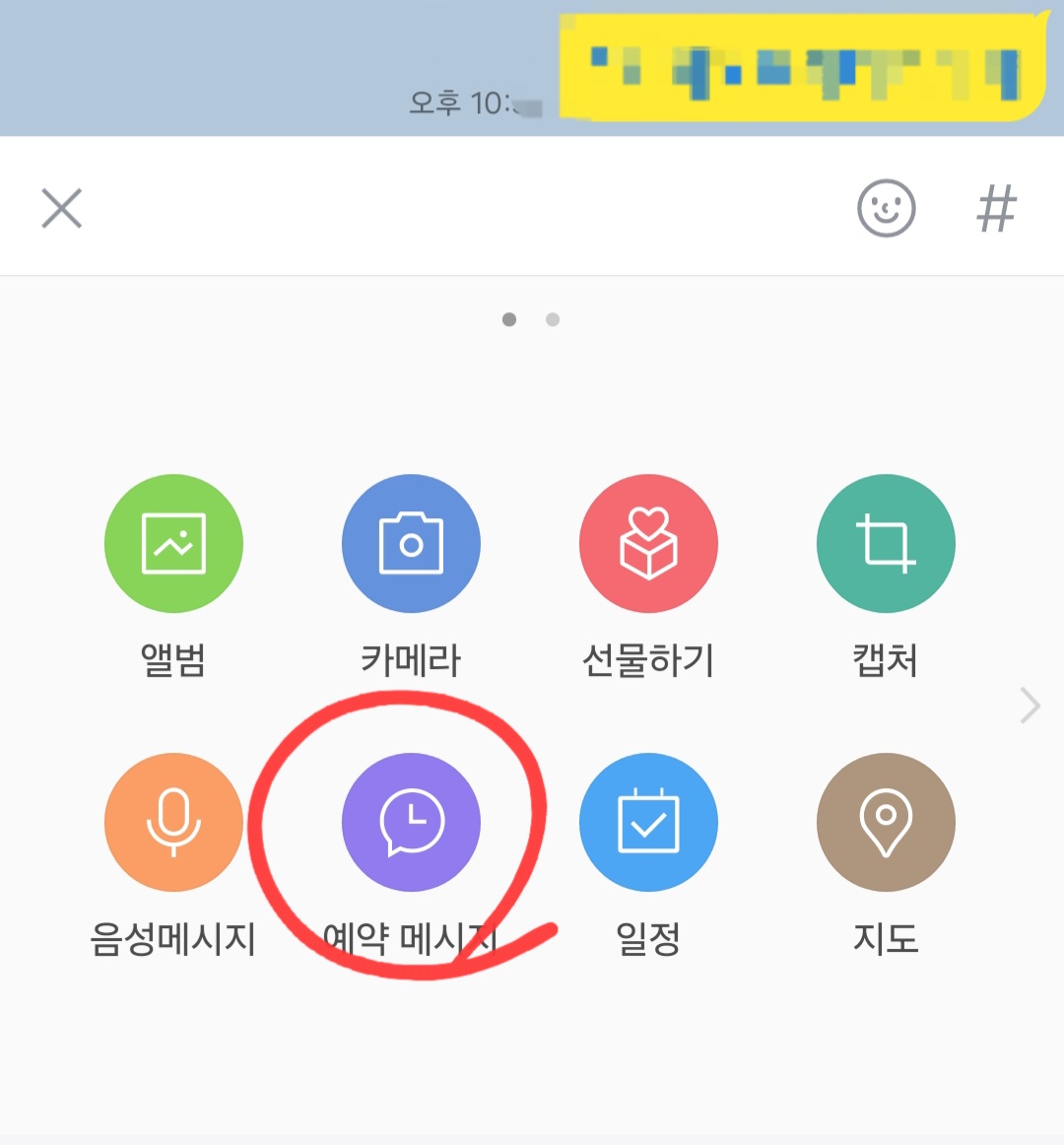 그리고, 글 입력 칸 왼쪽에 + 를 누르면 나오는 아래 메뉴 중에서 예약 메시지를 선택합니다.